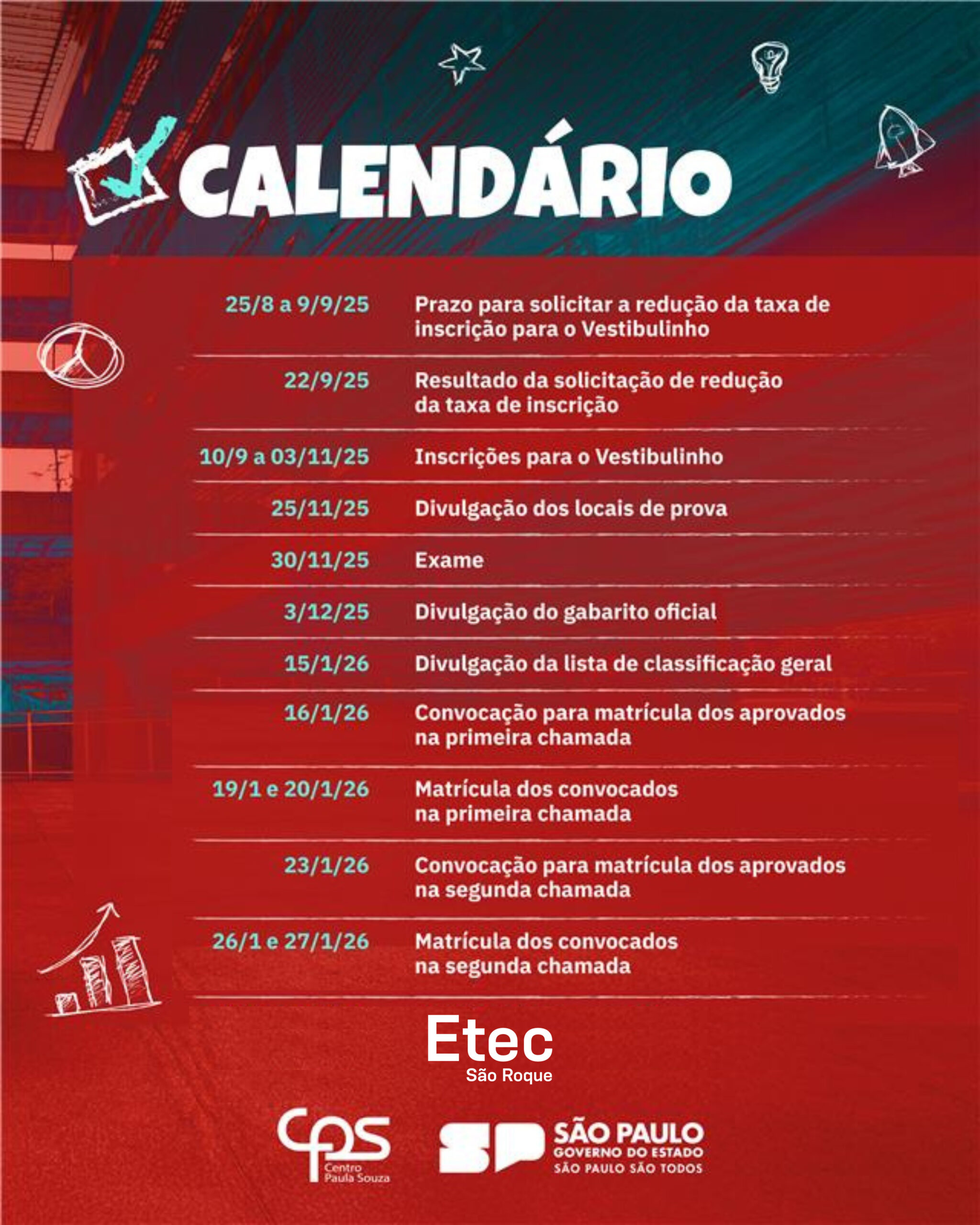 A Etec de São Roque está com inscrições abertas para o Vestibulinho do 1º semestre de 2026. São diversas opções de cursos gratuitos e de qualidade, com vagas também em Alumínio. Confira as datas e participe!