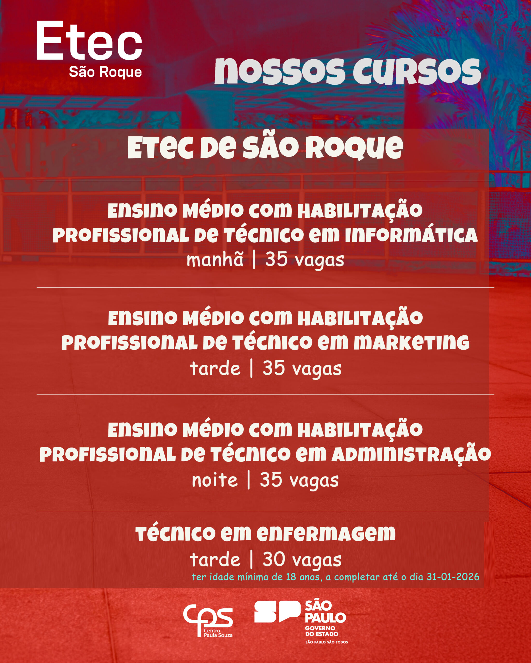 Técnico em Enfermagem | Tarde | 30 vagas (necessário ter 18 anos completos até 31/01/2026) |