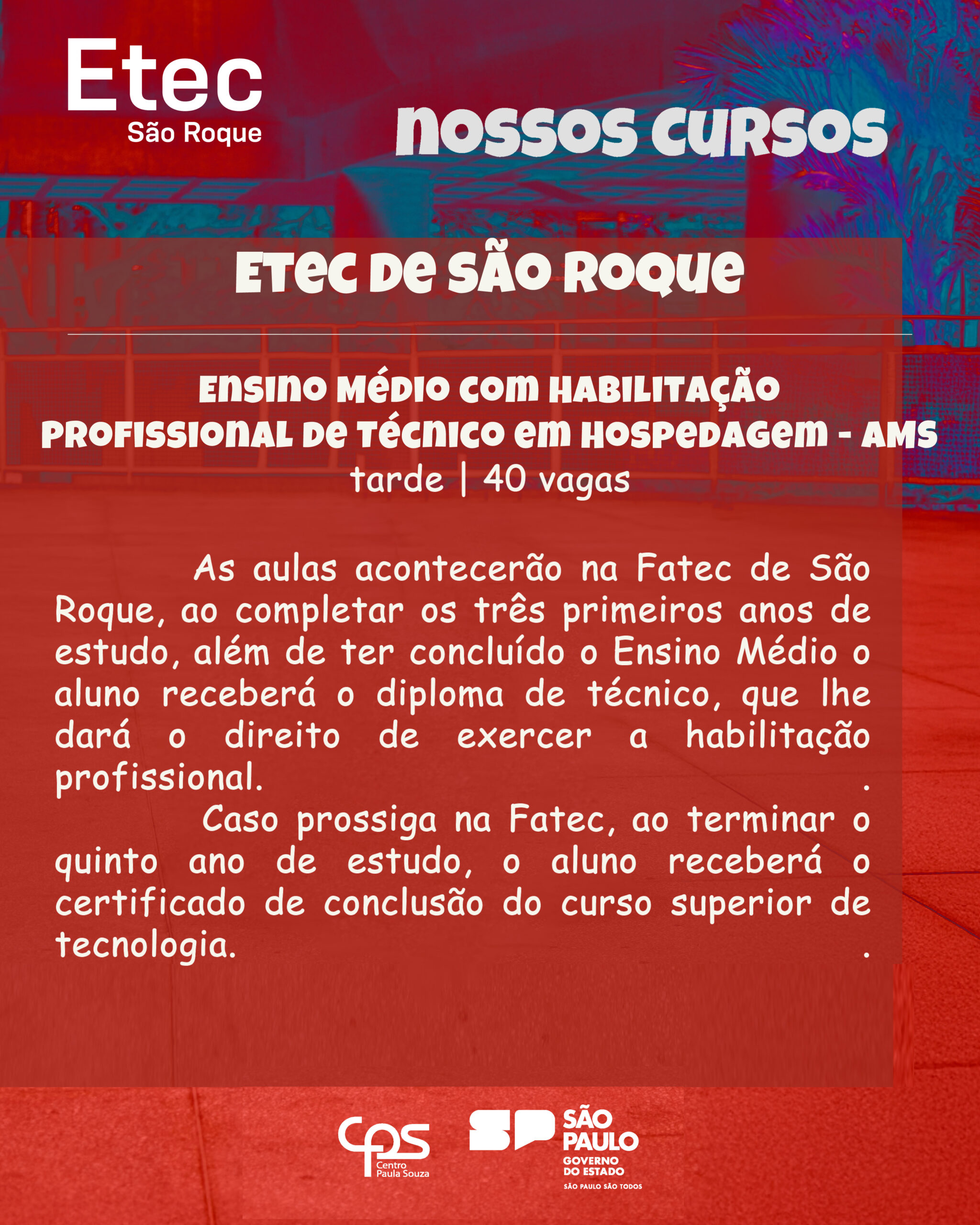 Ensino Médio com Habilitação Profissional de Técnico em Hospedagem – M-Tec-AMS | Tarde | 40 vagas (aulas na Fatec de São Roque, com possibilidade de prosseguir até o curso superior de tecnologia) |